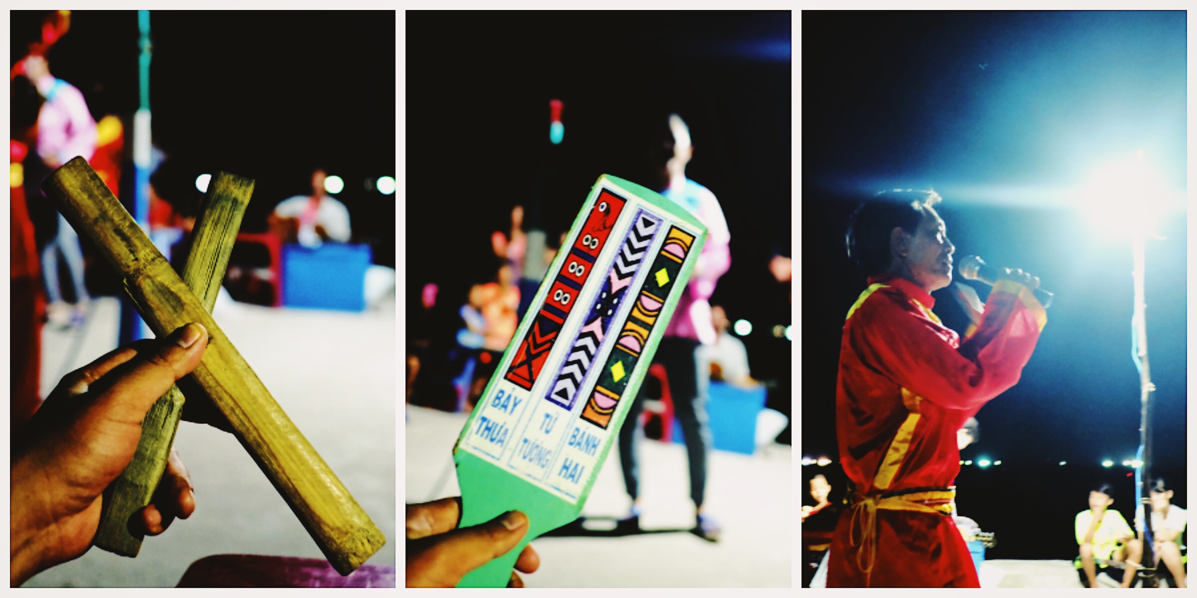 Chỉ với 5.000 đồng mỗi lá bài (ở Hội An là 20k) là đủ để vui dăm mười phút khi các cô chú, anh chị nghệ sĩ hô bài. Nói thiệt là mình nghe không hết được những gì họ hô, một phần vì tiếng địa phương, một phần vì trang thiết bị chưa được đầu tư hoàn chỉnh nghe khó hơn. Điều mình thấy lạ là có rất nhiều trẻ em vây quanh để chơi trò này. Mỗi lần trúng, họ sẽ được lì xì ngay 20k cho lá bài đó – ở Hội An thì sẽ được tặng một chiếc đèn lồng và đĩa CD hò Quảng.