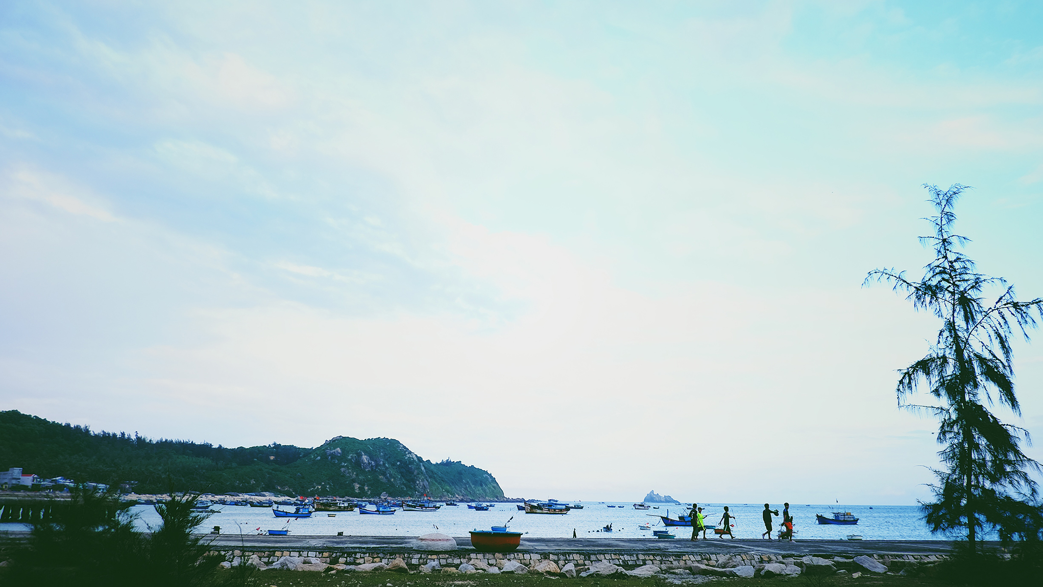 6h30 sáng, tụi mình bắt đầu lên chiếc xe taxi 7 chỗ với một nùi đồ mang theo để thẳng tiến ra bến cảng Hàm Tử ở cuối con đường Hàm Tử (Quy Nhơn). Hạ đồ xuống, chia nhau ra mang và bước ra gần bờ cảng để hỏi thăm chiếc tàu chợ chở hàng ra đảo Nhơn Châu nằm ngay đó. Chỉ mất vài phút để khai báo tên, tụi mình bắt đầu đưa hành lý lên tàu và tranh thủ ra đầu cảng để ăn vội tô bún bò trước khi hành trình tiến thẳng ra Cù Lao Xanh bắt đầu.