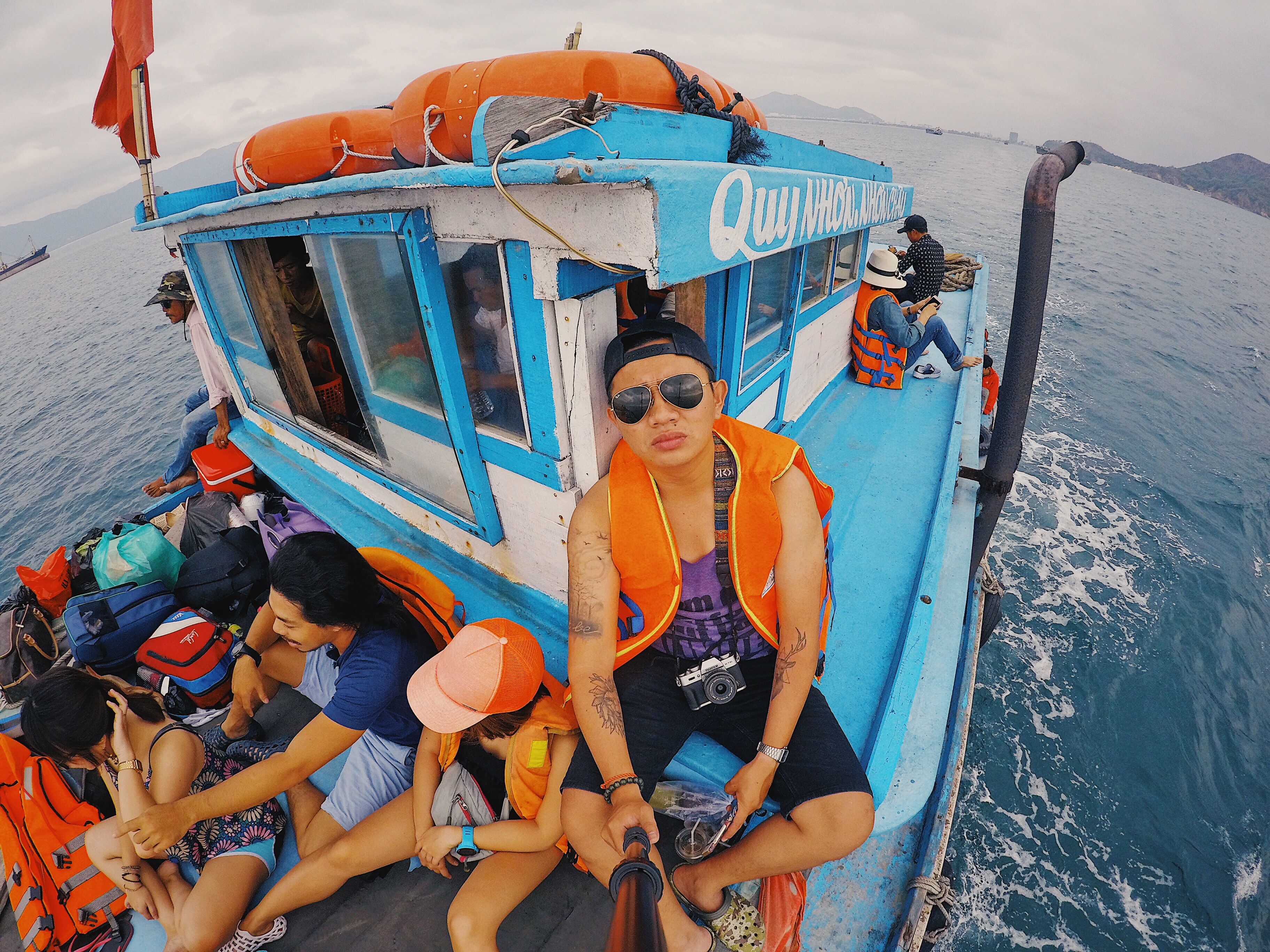 8h kém 1 phút.. Đúng như lời anh chủ tàu nói từ sáng. Tàu bắt đầu nhổ neo, nổ máy và thẳng tiến ra đảo Nhơn Châu, nơi đang chờ đợi tụi mình khám phá. Khi tàu đã rời cảng khoảng 10 phút, tụi mình bắt đầu leo lên nóc tàu để có tầm nhìn tốt hơn. Mình háo hức cho chuyến đi này lắm nên chả để ý gì tới cái sự nắng nóng của anh mặt trời đã lên cao. (gương mặt nhăn nhăn kinh điển :3)