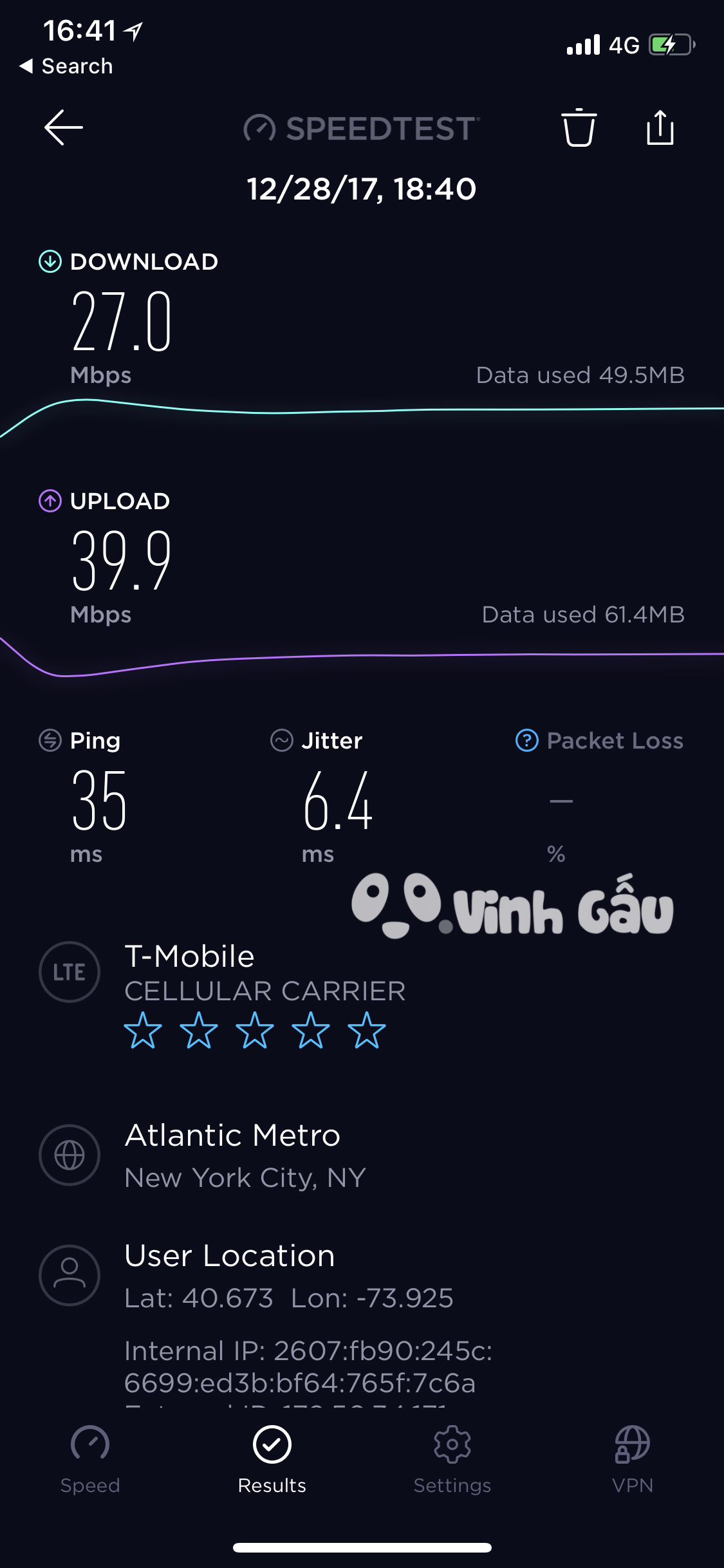 Rồi. Khi thấy điện thoại báo có sóng, báo tên nhà mạng T-Mobile & dấu 4G là biết SIM đã hoạt động tốt. ^^. Các bạn có thể vào trang speedtest.net để kiểm tra tốc độ 4G của SIM nha. 😀 Đây là tốc độ mình test khi còn ở sân bay JFK (New York) – quá ngon ^^