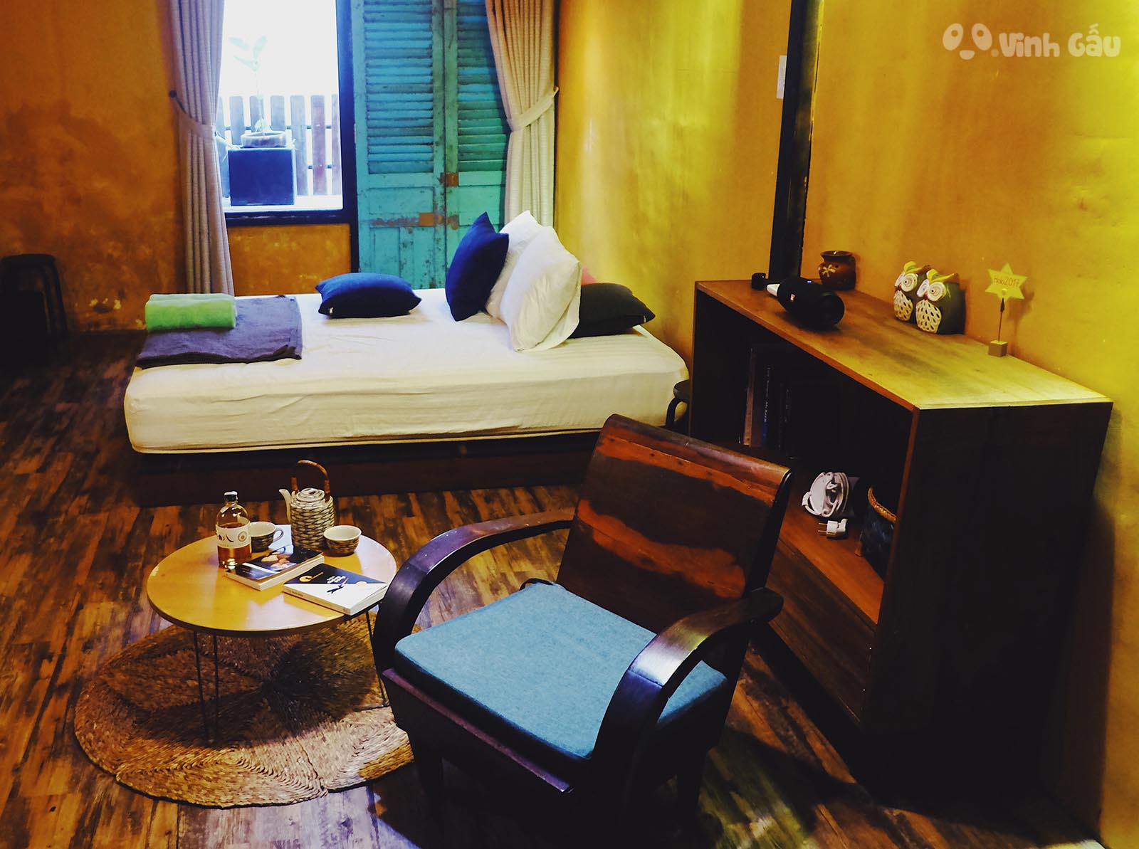 Ở đây có 03 căn. Tuy nhiên mình thấy căn số 03 là đẹp nhất và thoải mái nhất. Mình thích căn này vì sự thoải mái khi vừa đặt chân vào căn phòng ấy. Không gian rộng rãi, thiết kế đơn giản kiểu vintage. Thích mê cái ghê dựa bằng gỗ, lùn lùn, ngồi mát đ*t lắm. Như kiểu ghế dựa hồi xưa nhà mình có một bộ bàn ghế vậy.